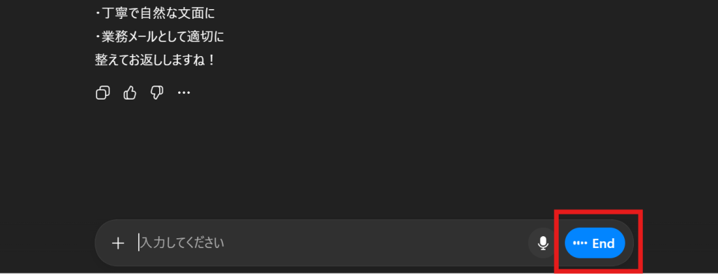 → 画面下部の「End」ボタンをタップなお、ボイスモードが有効になっている間は、テキストで入力してもAIの返信は音声付きで返ってきます。