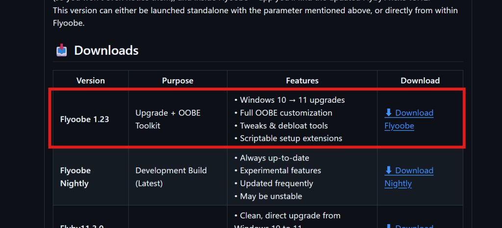 Flyoobe をダウンロード:GitHub の公式リポジトリなどから最新版を取得します(https://github.com/builtbybel/Flyoobe/releases)。