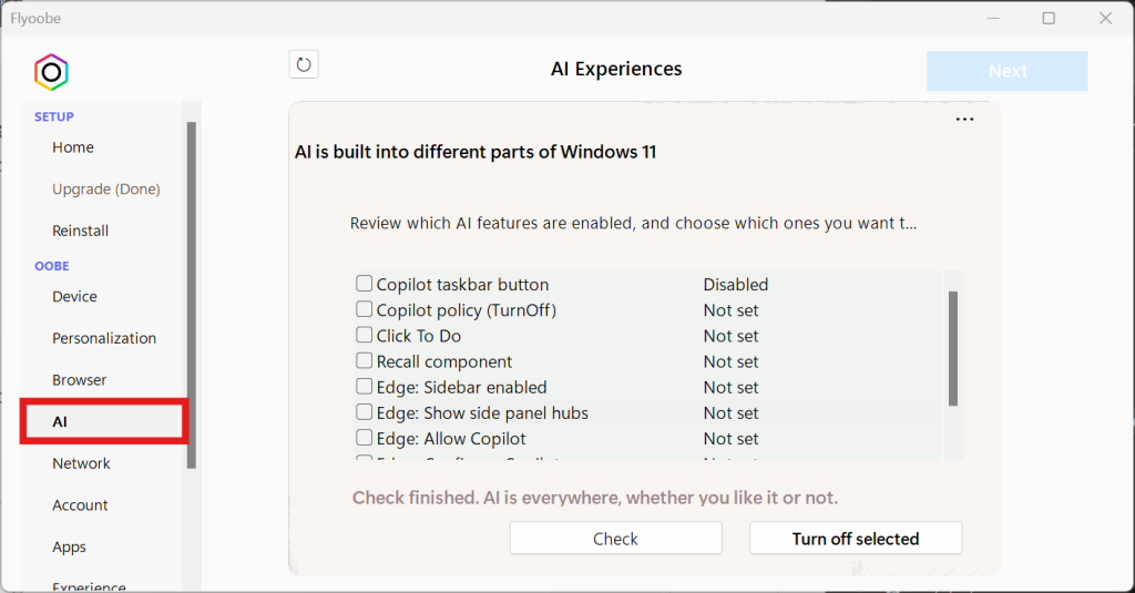 Flyoobe の UI には “AI” タブがあり、インストールされうる AI 関連機能を検出し、除去するチェックボックスが表示されます。希望するものを選んで「Turn off selected」などの操作を行います。