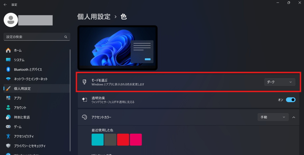 4. 「設定 > 個人用設定 > 色」でモードを “ダーク” に切り替える